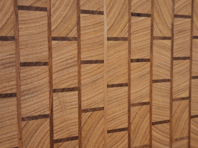 Admirez le sublime contraste entre le Frêne clair et la bande centrale en Noyer. Cette technique protège durablement le tranchant de vos couteaux.