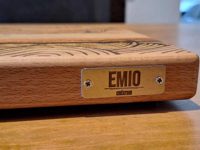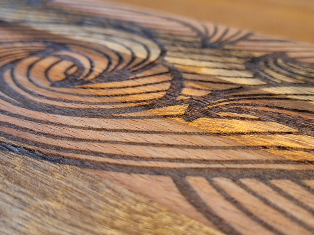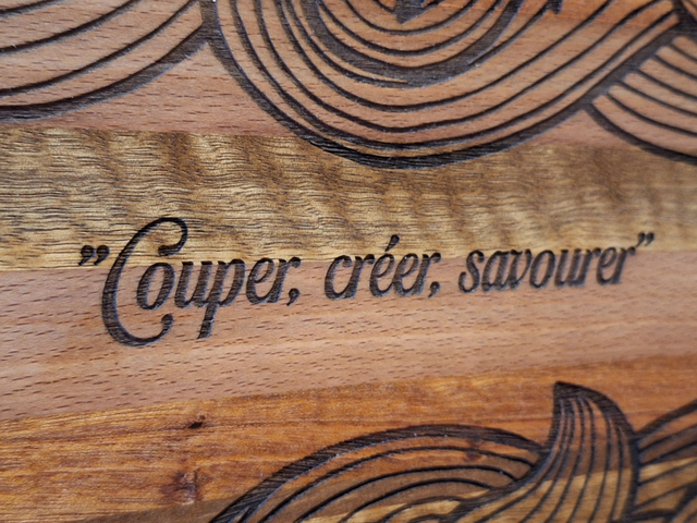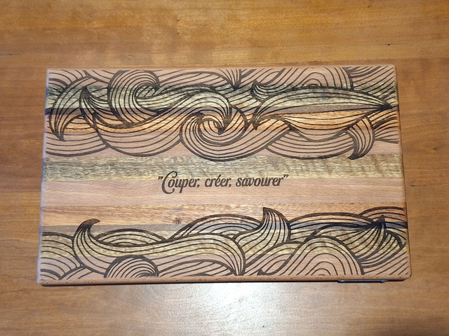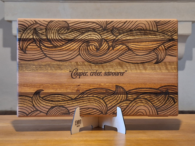 ​Cette pièce unique allie l'utile à l'agréable : une planche à découper ou de présentation, fabriquée avec un assemblage harmonieux de Hêtre, Noyer et Iroko, sublimée par une magnifique gravure laser aux motifs ondulants.