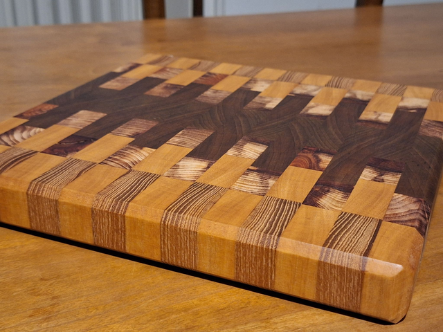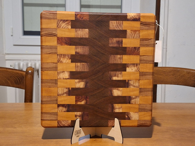 Attention, on s'attaque ici à l'une de mes pièces les plus abouties. Ce n'est plus seulement une planche, c'est une véritable marqueterie structurelle réalisée selon la technique exigeante du bois de bout.
